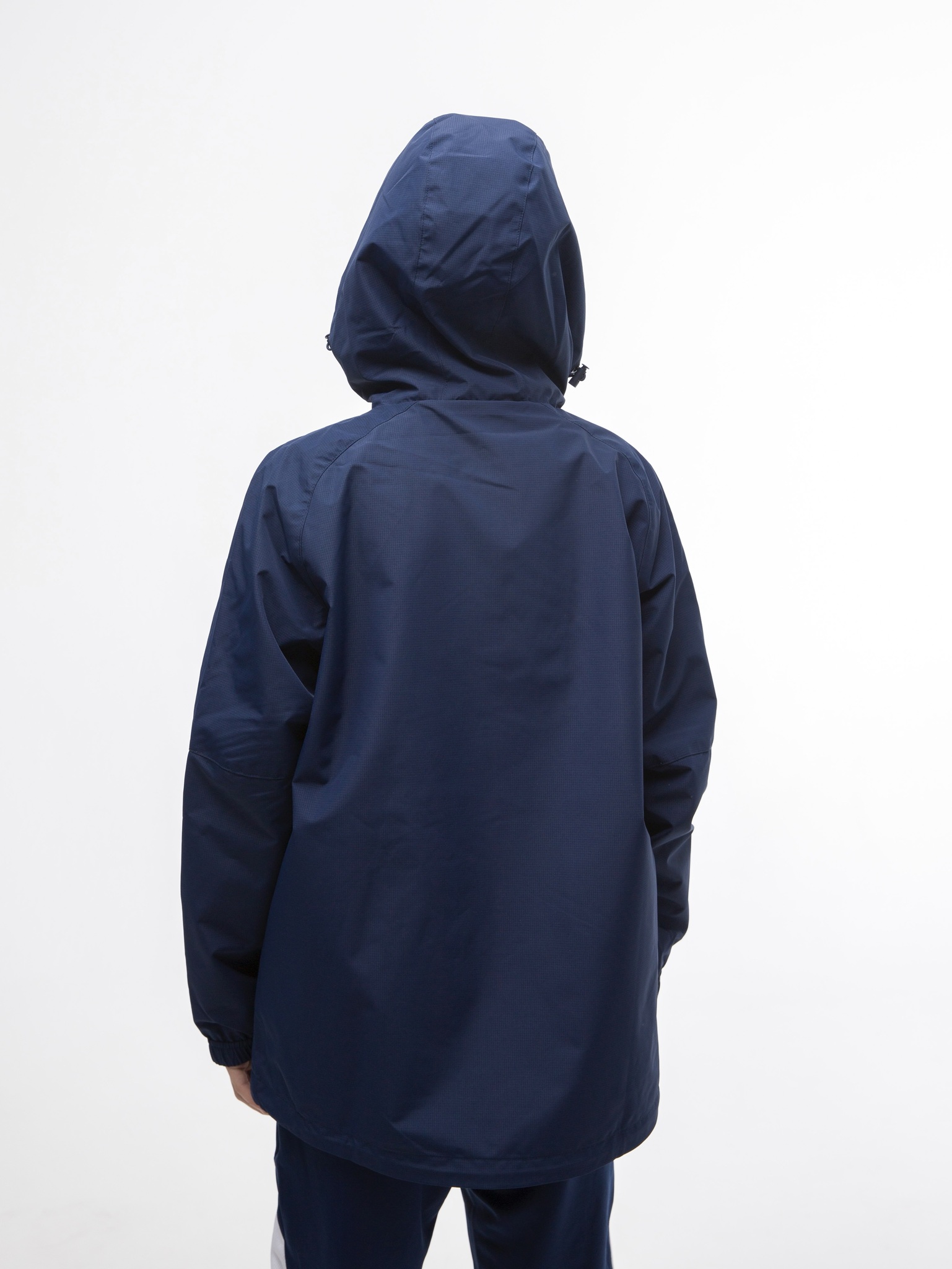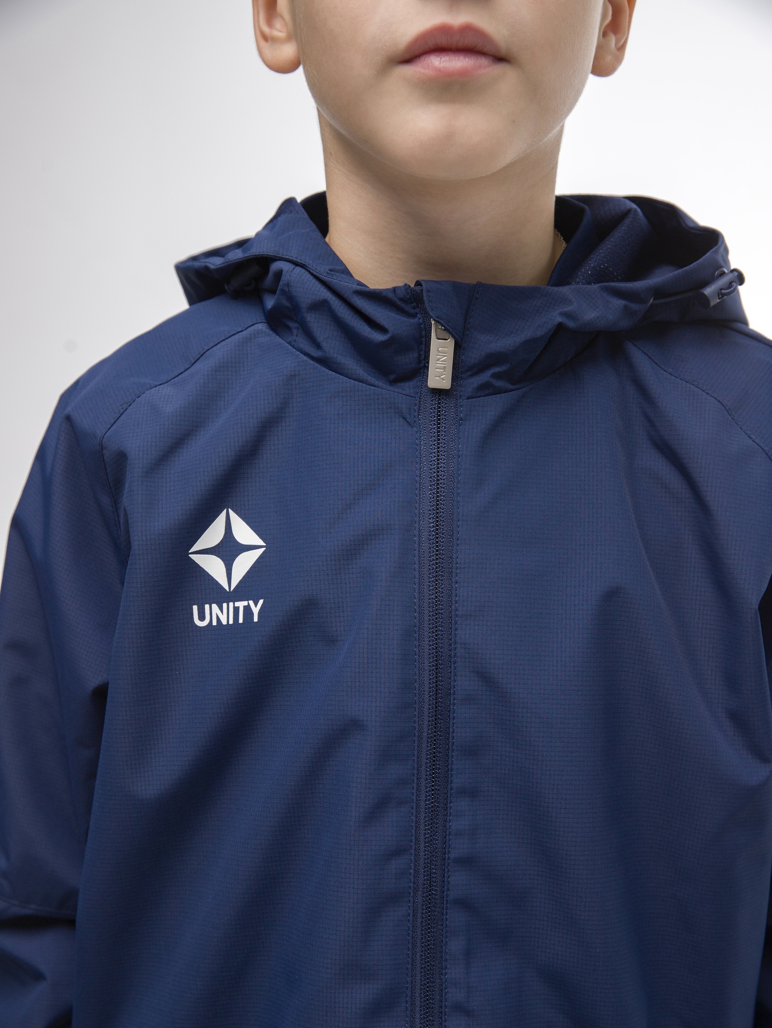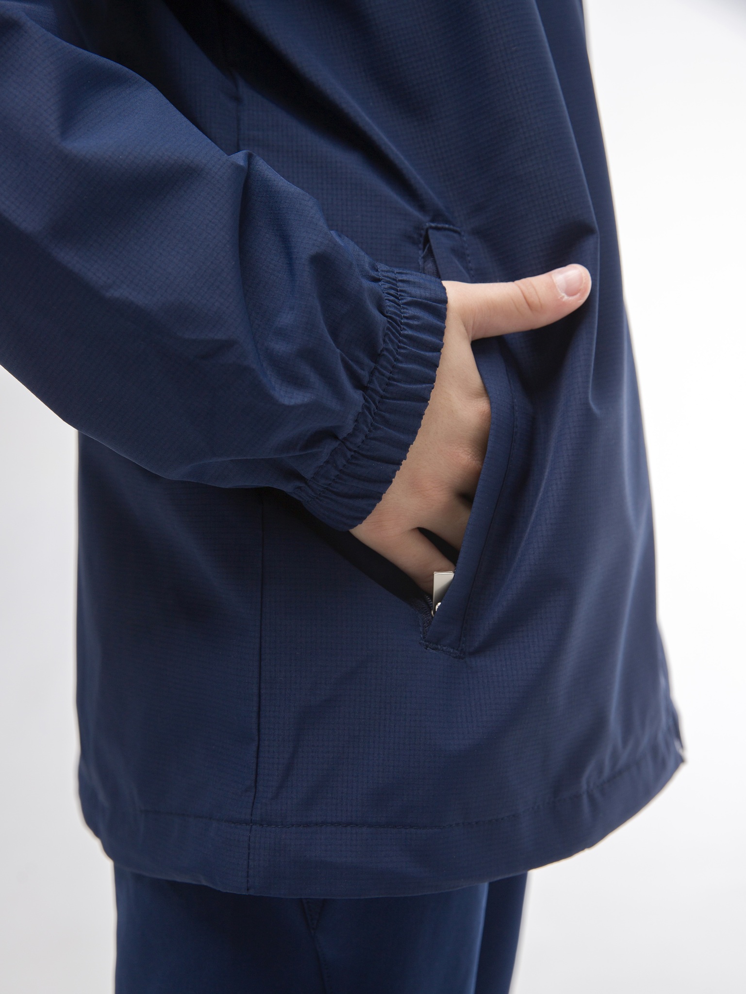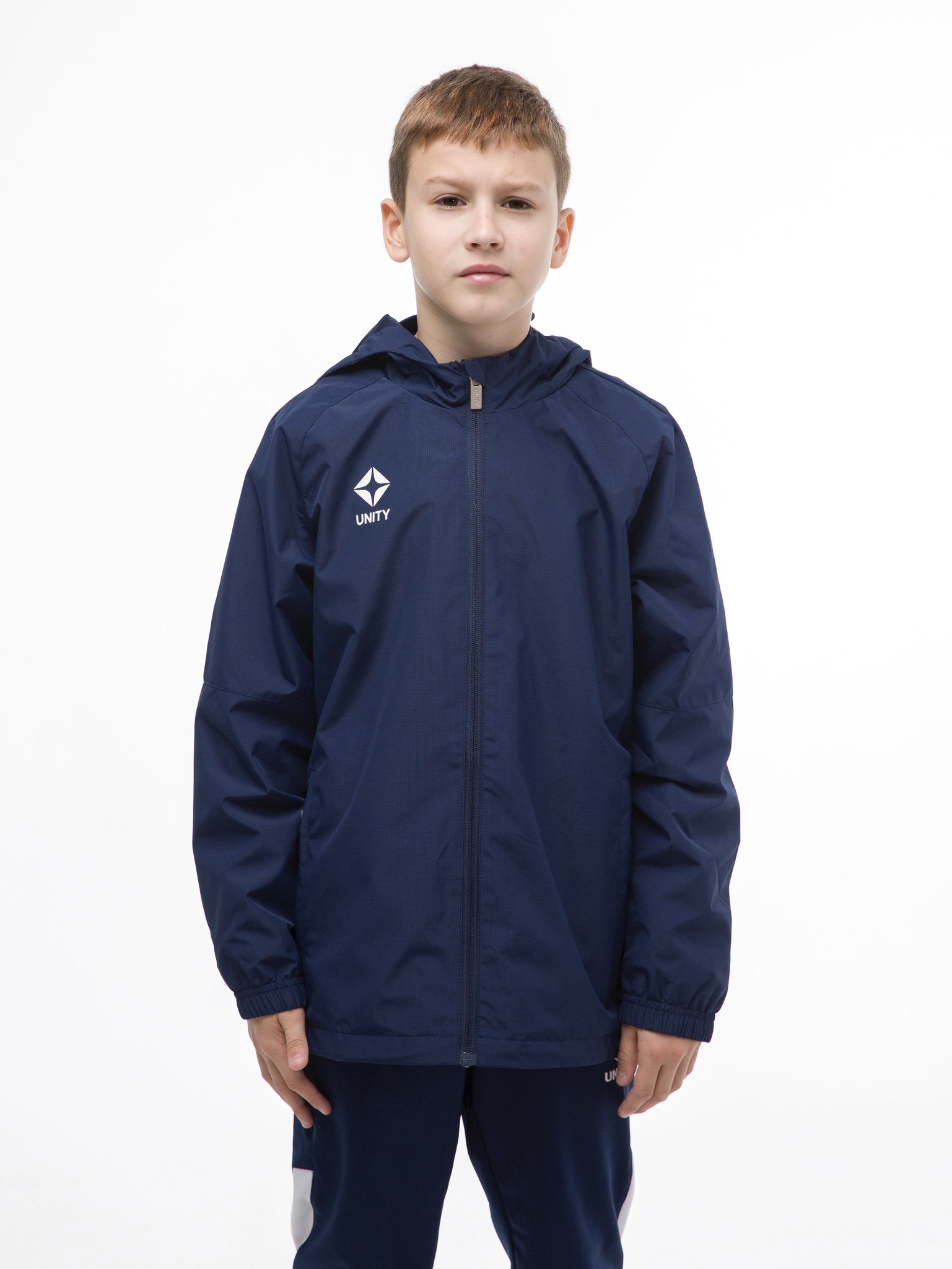 Данная ветровка выполнена в свободном покрое, обеспечивающем максимальную подвижность ребенка во время активных занятий спортом. Длинные рукава и наличие капюшона защитят от ветра благодаря специальной ветроотталкивающей мембране. Темно-синяя гамма с контрастным принтом делает модель актуальной и привлекательной. Подходит для футбола и беговых дисциплин.